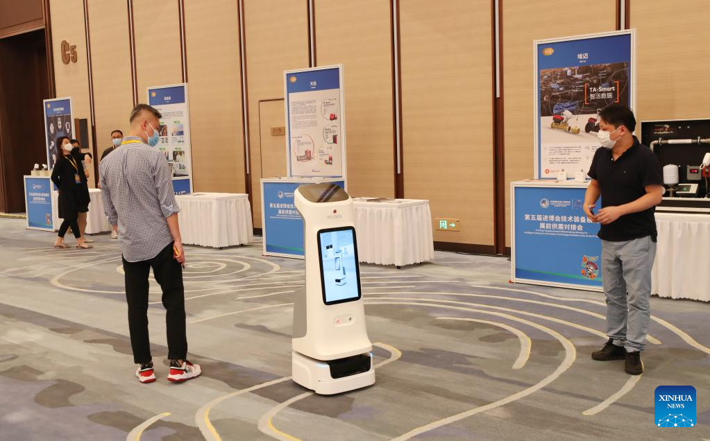 A robot for epidemic control purpose is displayed outside the venue of a pre-expo supply-demand matchmaking meeting for the Intelligent Industry &Information Technology Exhibition Area of the fifth China International Import Expo (CIIE) at the National Exhibition and Convention Center (Shanghai) in east China's Shanghai, Aug. 8, 2022. (Xinhua/Fang Zhe)