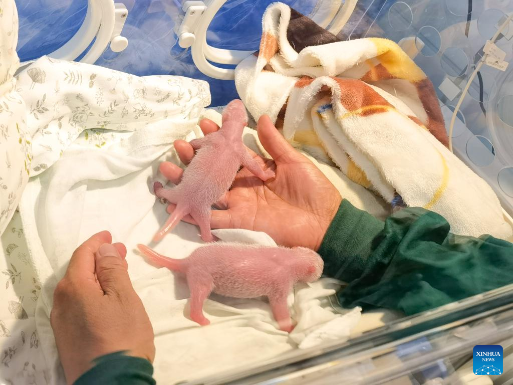 Photo taken on July 22, 2022 shows twin cubs of giant panda Er Shun at Chongqing Zoo in southwest China's Chongqing Municipality. Giant panda Er Shun, born in 2007, returned to China in November of 2020 after staying in the Toronto Zoo and the Calgary Zoo in Canada since March of 2013. Er Shun gave birth to a pair of twin brothers on July 22, 2022 at the Chongqing Zoo after she had succeeded in natural mating with male panda Qing Qing in the China Conservation and Research Center for the Giant Panda in March this year. The panda twin brothers made their debut at the zoo Monday. (Chongqing Zoo/Handout via Xinhua)