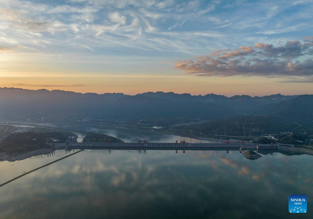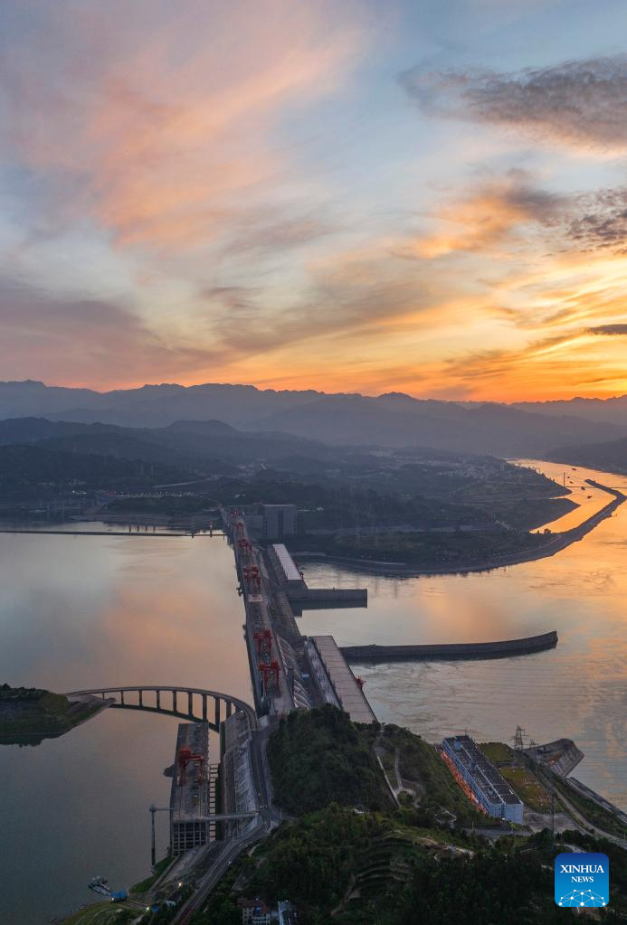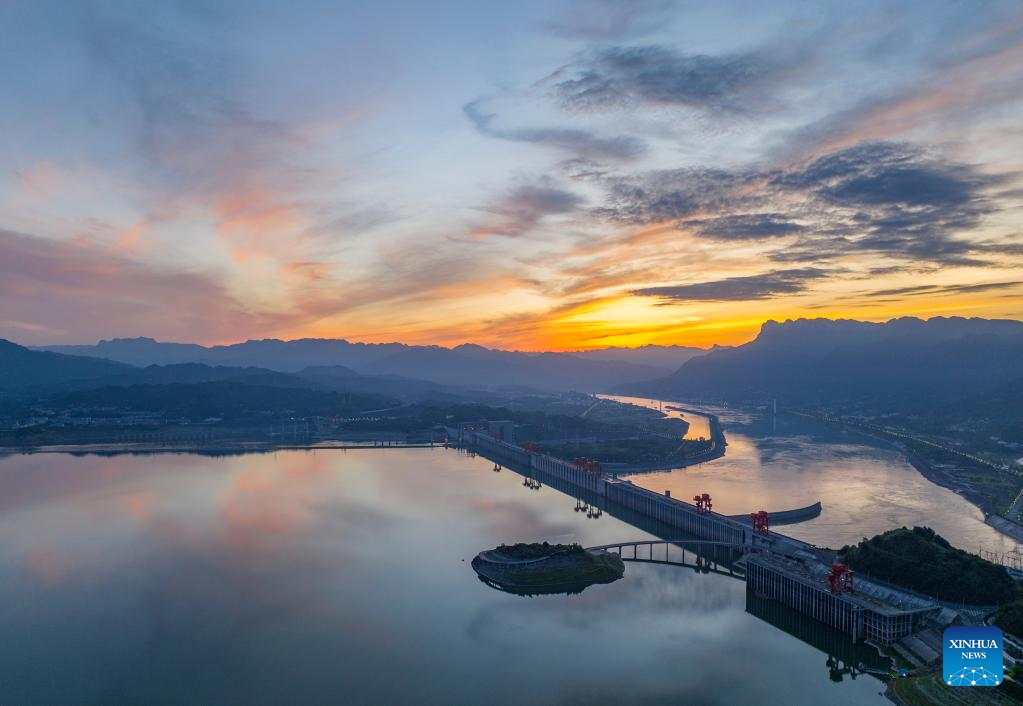 Aerial photo taken on Aug. 9, 2022 shows the Three Gorges Dam at dawn in Zigui County of Yichang, central China's Hubei Province. (Photo by Wang Gang/Xinhua)