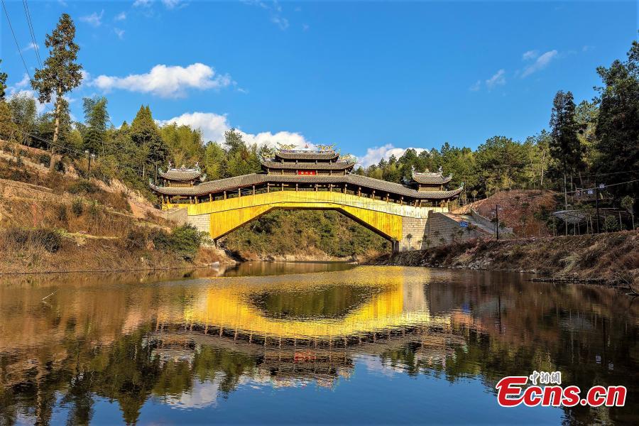 File photo shows the Shuanglong wooden-roofed arch bridge in Xietan town of Shouning county, Ningde, east China's Fujian Province. (Photo: China News Service/Gong Jian)