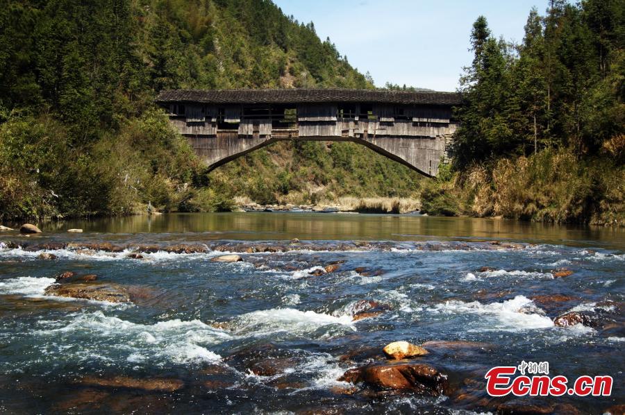 File photo shows the Zhuling wooden-roofed arch bridge in Zhoudun village of Siqiao town, Zhouning county, Ningde, east China's Fujian Province. (Photo: China News Service/Li Hongyuan)