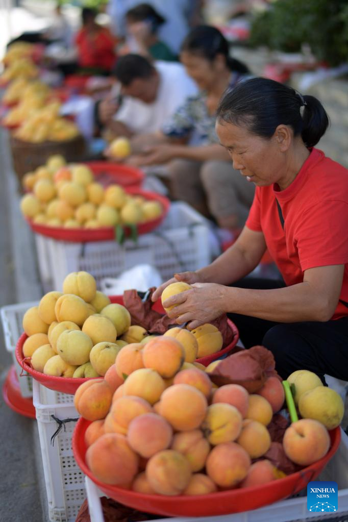Villagers sell peaches in Banxi Village of Tonglin Town in Qiandongnan Miao and Dong Autonomous Prefecture, southwest China's Guizhou Province, Aug. 10, 2022. Villagers in Banxi Village are busying harvesting fruits such as peaches, pears and plums amid the harvest season. (Xinhua/Yang Ying)