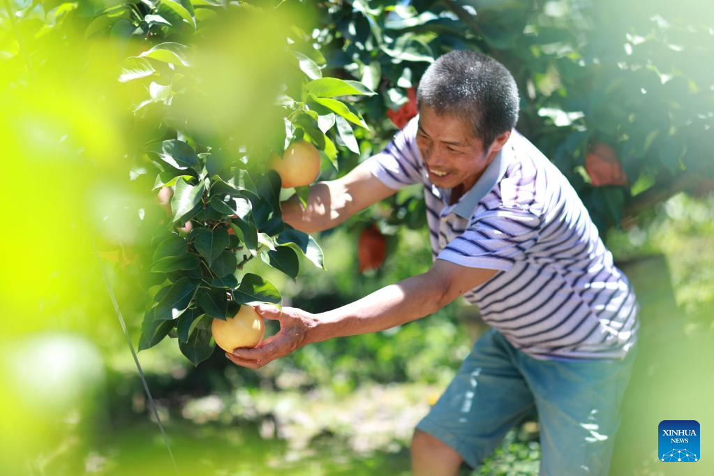 A villager harvests pears in Banxi Village of Tonglin Town in Qiandongnan Miao and Dong Autonomous Prefecture, southwest China's Guizhou Province, Aug. 10, 2022. Villagers in Banxi Village are busying harvesting fruits such as peaches, pears and plums amid the harvest season. (Photo by Luo Hui/Xinhua)