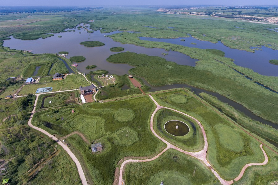 Aerial photo taken on July 28, 2022 shows a view of the Sanggan River National Wetland Park in Datong, north China's Shanxi Province. (Xinhua/Yang Chenguang)