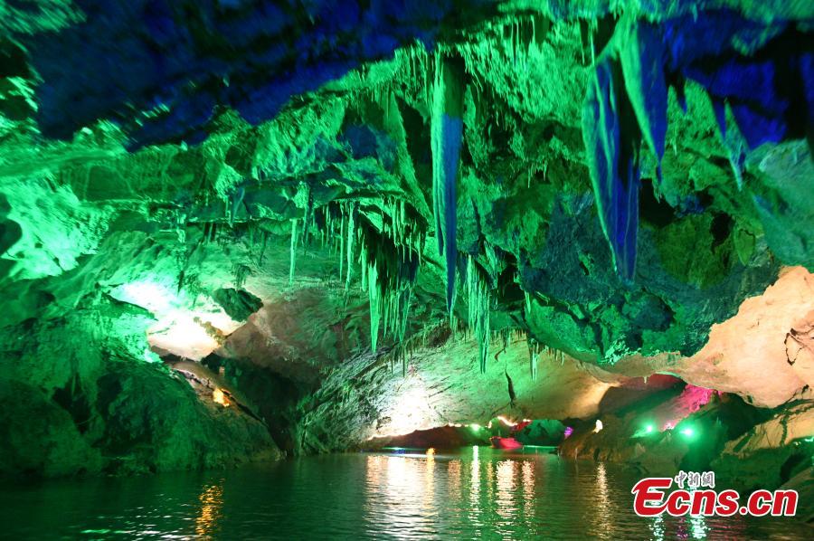 Colored lights illuminate the geological formations at the Benxi Water Cave, a large-scale underground karst, in Benxi, northeast China's Liaoning Province, Aug. 10, 2022. (Photo: China News Service/Yu Haiyang)