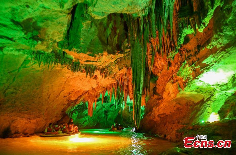 Colored lights illuminate the geological formations at the Benxi Water Cave, a large-scale underground karst, in Benxi, northeast China's Liaoning Province, Aug. 10, 2022. (Photo: China News Service/Yu Haiyang)