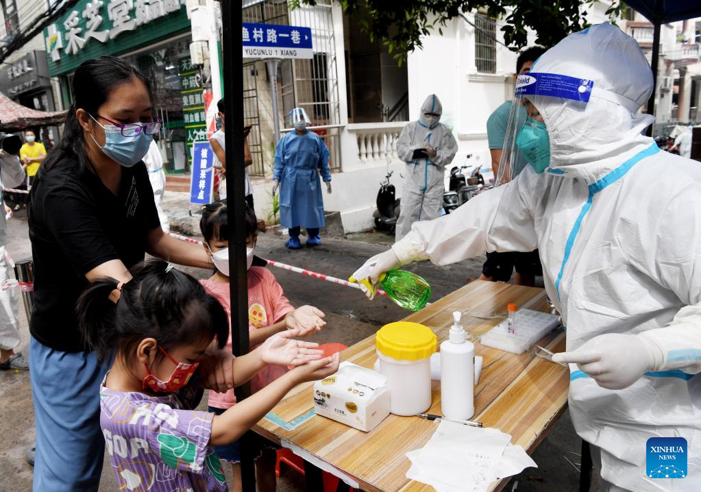 Yuan Qingyi, a medical worker from central China's Henan Province, disinfects residents in Sanya, south China's Hainan Province, Aug. 11, 2022.