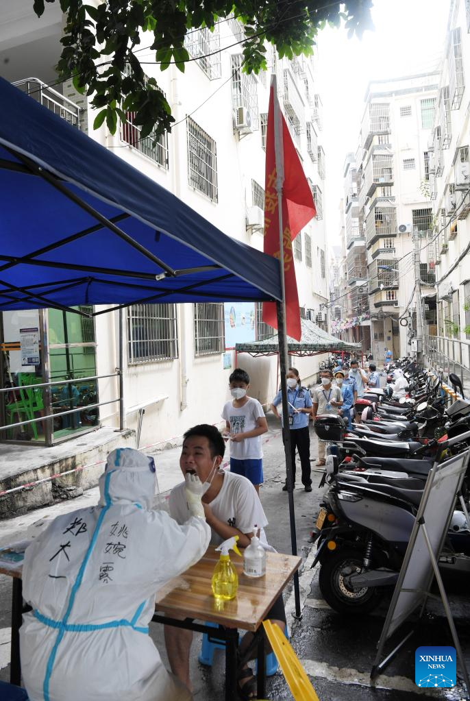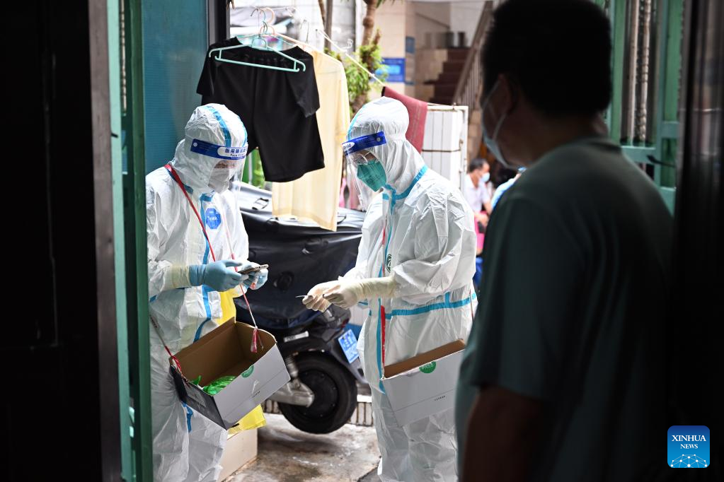 Medics from central China's Henan Province provide door-to-door sampling service for residents for nucleic acid testing in Sanya, south China's Hainan Province, Aug. 11, 2022.
