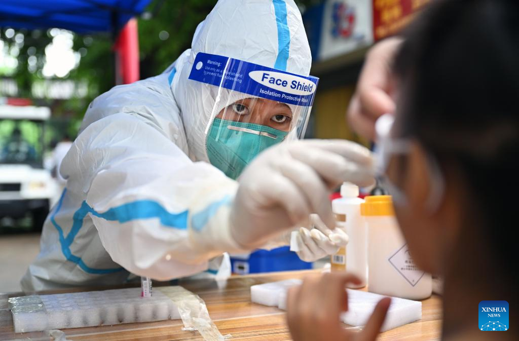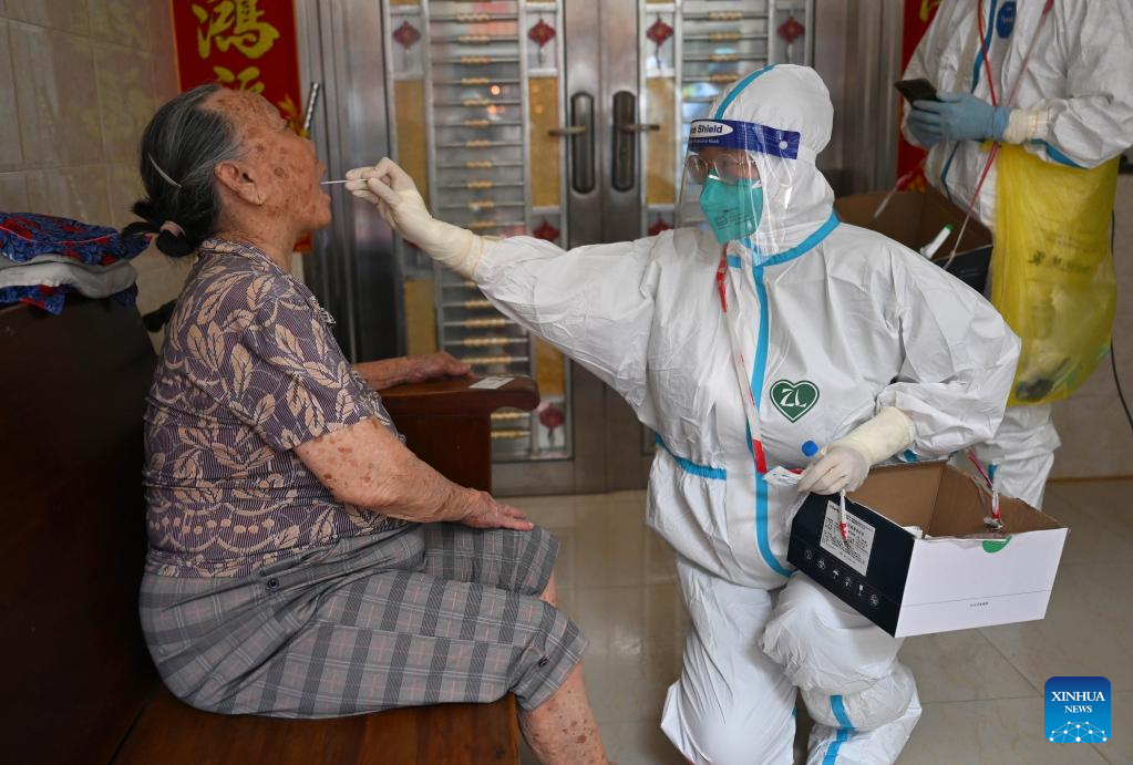 Yuan Qingyi, a medical worker from central China's Henan Province, takes a swab sample from a resident for nucleic acid testing in Sanya, south China's Hainan Province, Aug. 11, 2022.