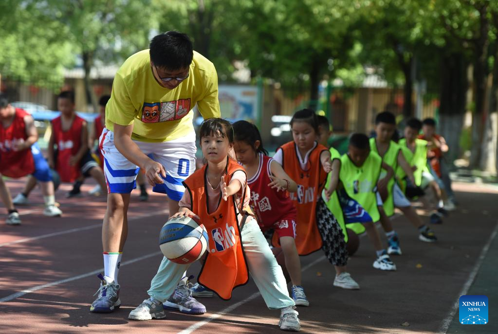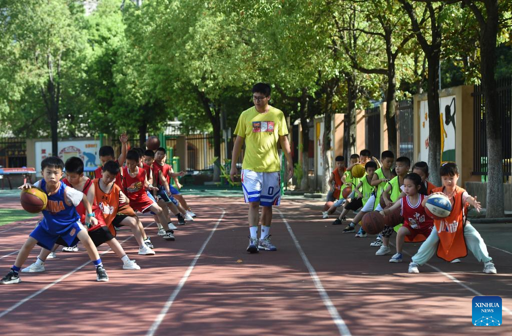 Students learn to play basketball in Hefei, east China's Anhui Province, Aug. 11, 2022.