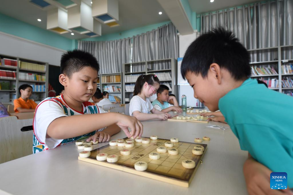 Students learn to play Chinese chess in Hefei, east China's Anhui Province, Aug. 11, 2022.