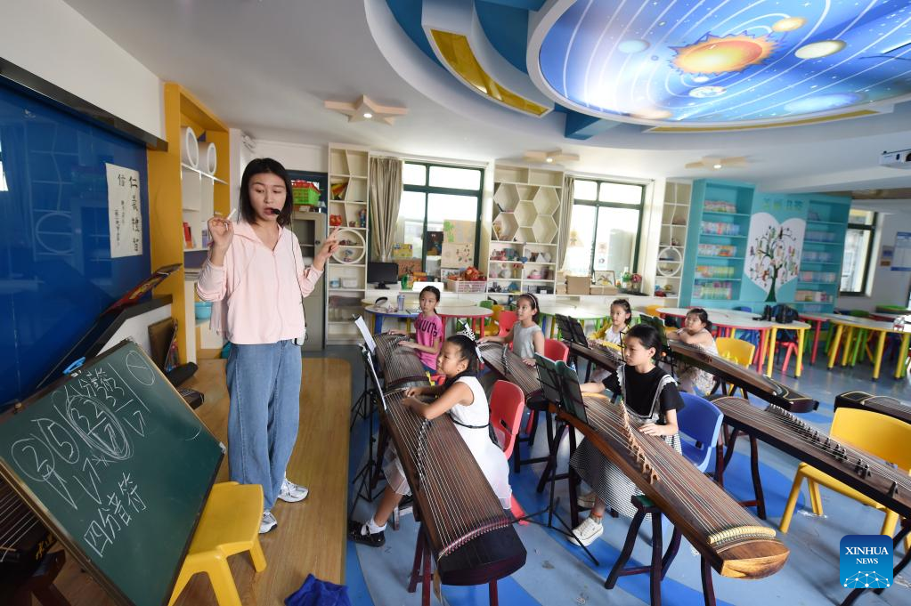 Students learn to play guzheng, or Chinese zither, in Hefei, east China's Anhui Province, Aug. 10, 2022.