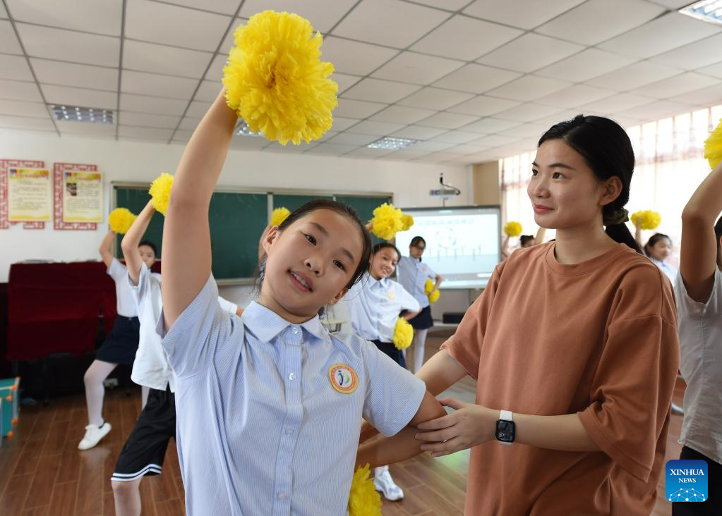 Students learn cheerleading dance in Hefei, east China's Anhui Province, Aug. 11, 2022.