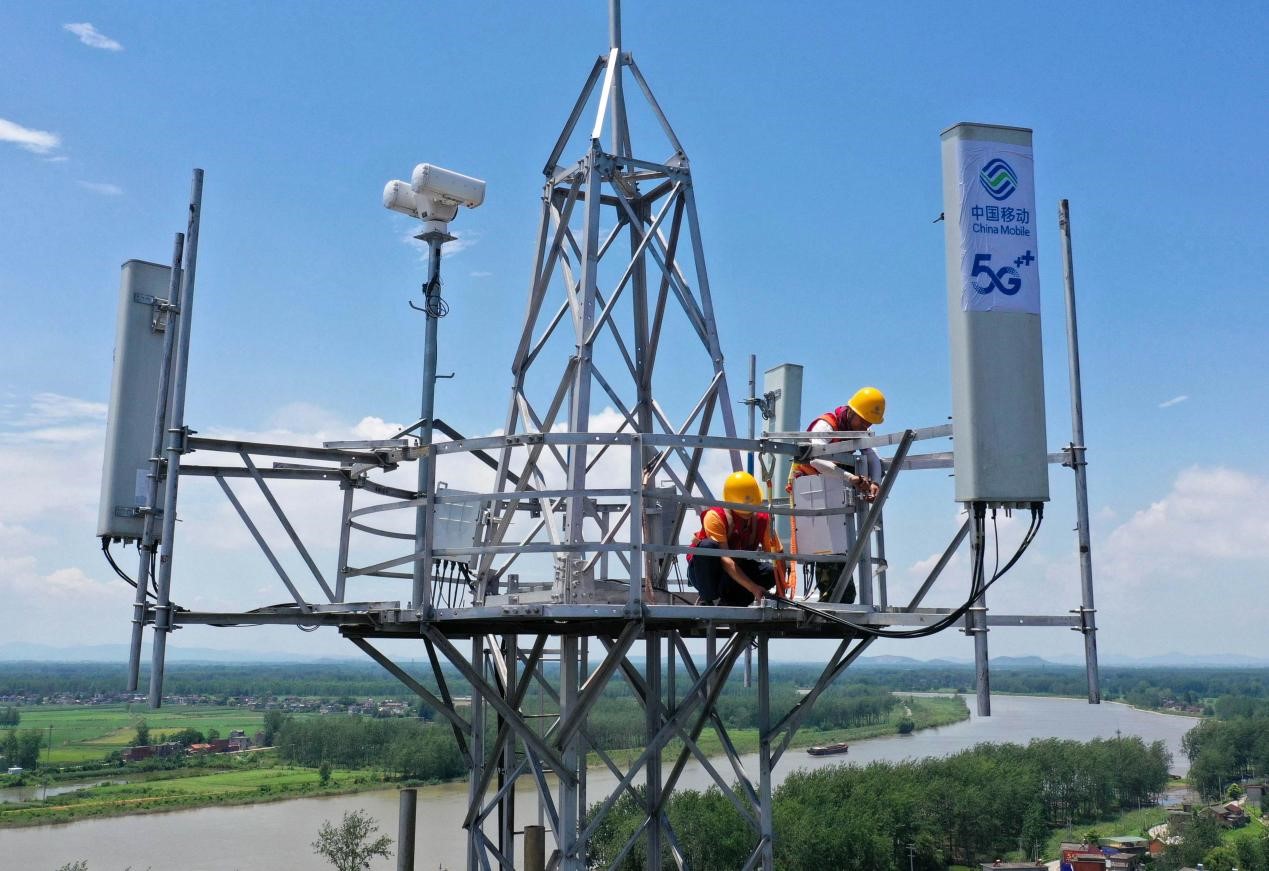 Photo taken on July 8, 2022 shows workers adjusting antenna at a 5G base station in Xuba township, Tongling, east China's Anhui Province. (People's Daily Online/Guo Shining)