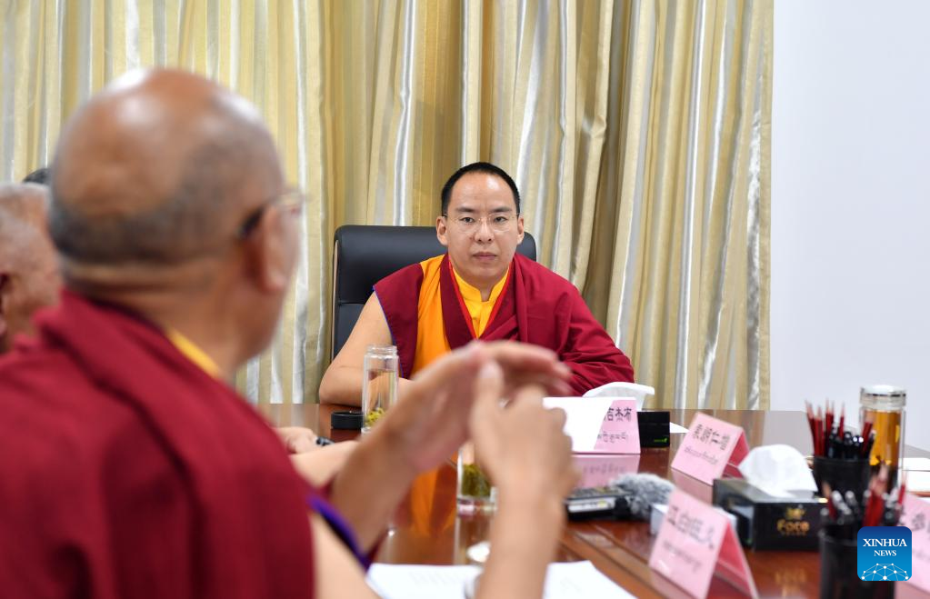 Panchen Erdeni Chos-kyi rGyal-po holds discussions with eminent monks on June 1, 2022. Panchen Erdeni Chos-kyi rGyal-po had performed his daily duties as president of the Tibet branch of the Buddhist Association of China in Lhasa since mid-May. (Xinhua/Chogo)