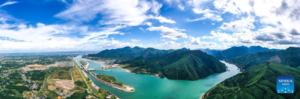 Aerial photo shows the Dateng Gorge water conservancy project in Guiping City, south China's Guangxi Zhuang Autonomous Region, Aug. 9, 2022.