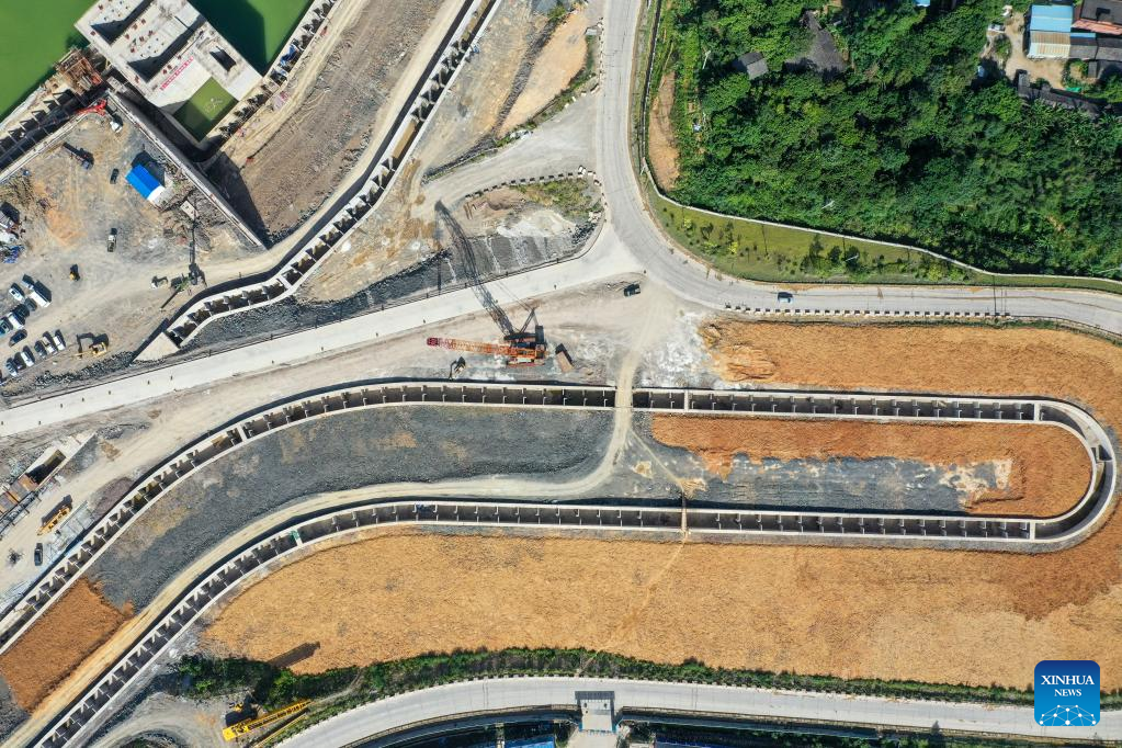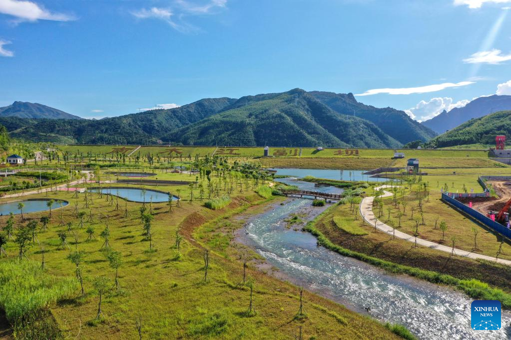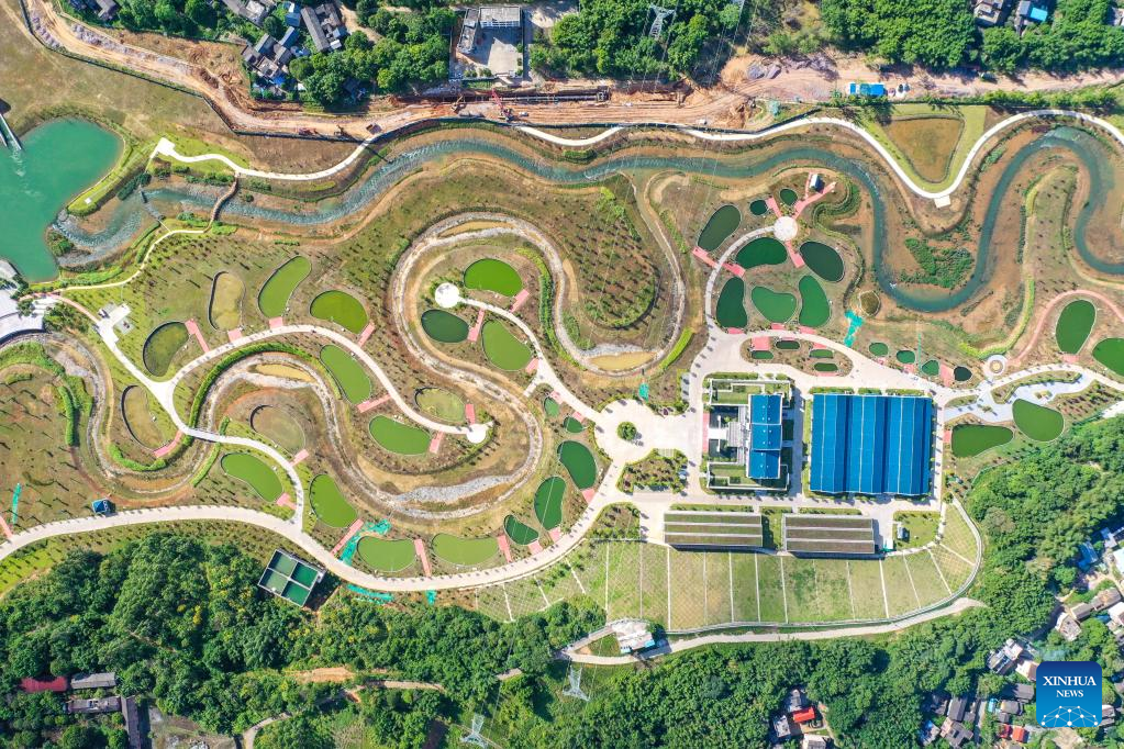 Aerial photo shows the nature-imitated fishway of the auxiliary dam in Nanmu River of the Dateng Gorge water conservancy project in Guiping City, south China's Guangxi Zhuang Autonomous Region, Aug. 9, 2022.