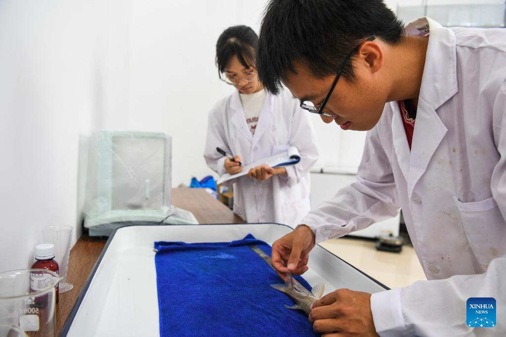 Researchers check fish fry at the Dateng Gorge water conservancy project in Guiping City, south China's Guangxi Zhuang Autonomous Region, Aug. 10, 2022.