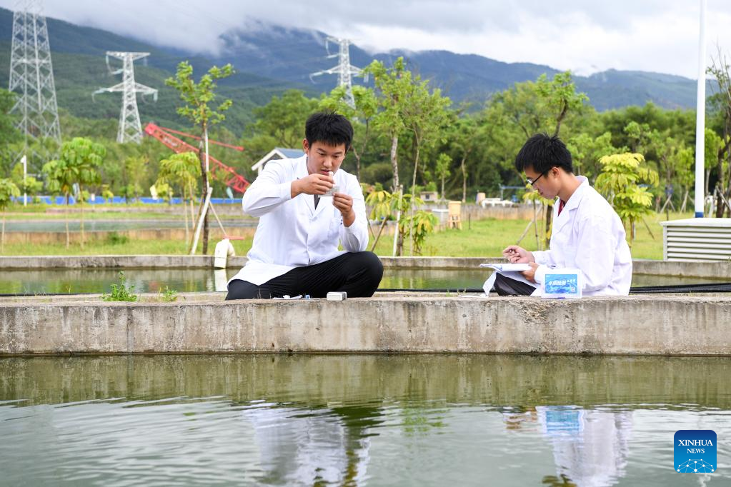 Researchers work at a rare fish conservation center of the Dateng Gorge water conservancy project in Guiping City, south China's Guangxi Zhuang Autonomous Region, Aug. 10, 2022.