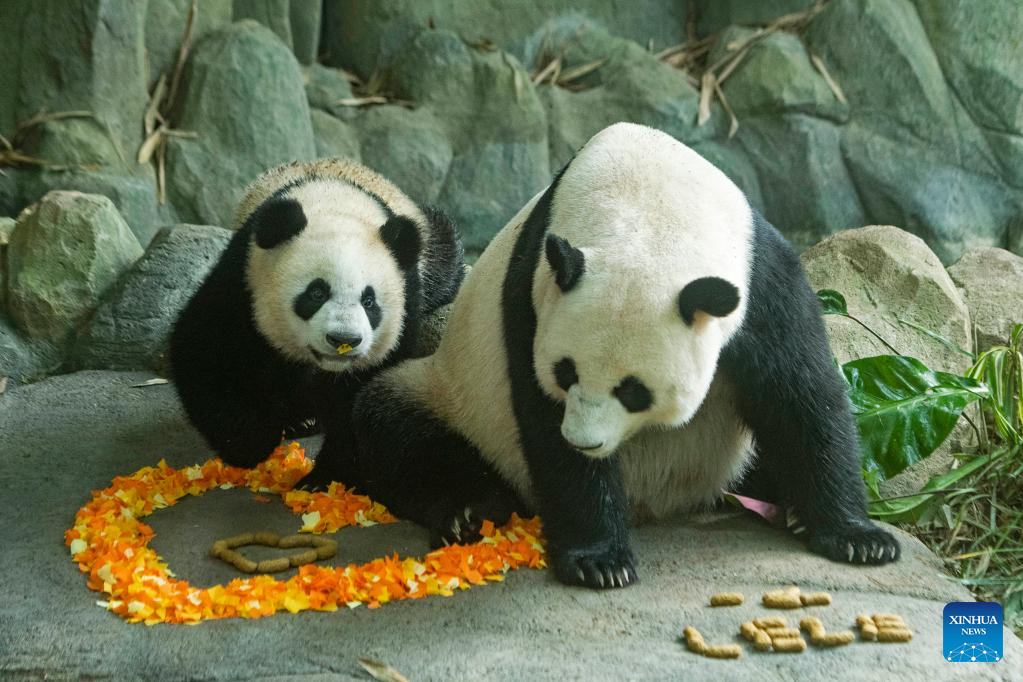 Panda cub Le Le (L) and mother panda Jia Jia attend Le Le's first birthday celebration held at Singapore's River Wonders on Aug. 12, 2022. (Photo by Then Chih Wey/Xinhua)