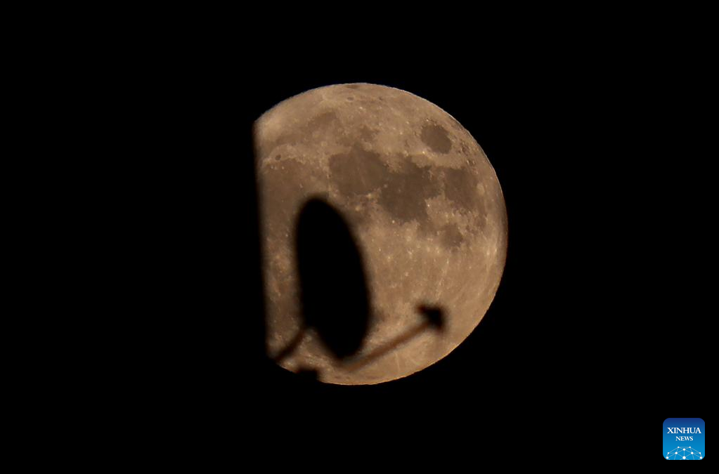 Photo taken on Aug. 11, 2022 shows a full moon in the sky above Beirut, Lebanon. (Xinhua/Bilal Jawich)