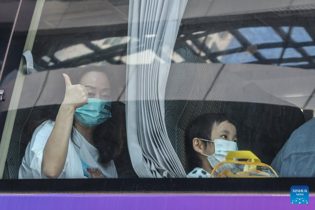 Stranded tourists take a coach to Haikou Meilan International Airport in Haikou, south China's Hainan Province, Aug. 14, 2022.
