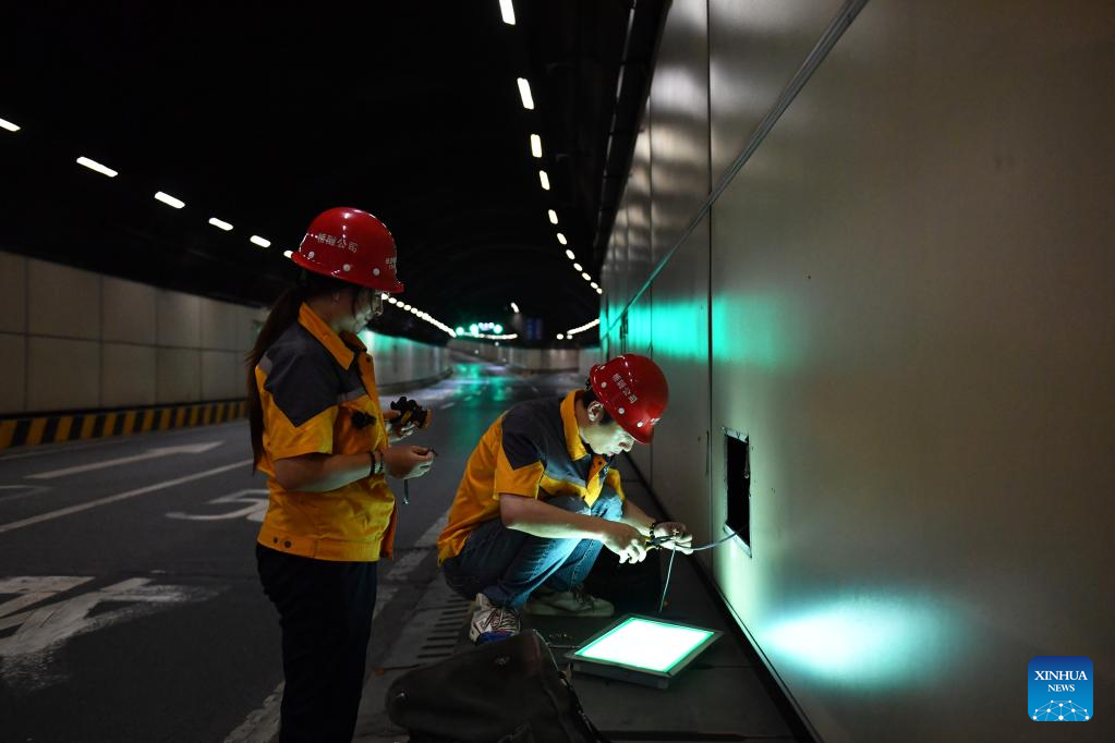 Workers conduct the maintenance of Yingpan Road tunnel in Changsha, central China's Hunan Province, Aug. 14, 2022.