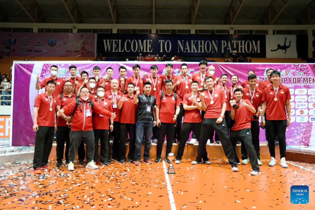 Team China celebrate during the awarding ceremony after winning the 2022 AVC (Asian Volleyball Confederation) Cup final match against Japan in Nakhon Pathom, Thailand, Aug. 14, 2022. (Xinhua/Wang Teng)