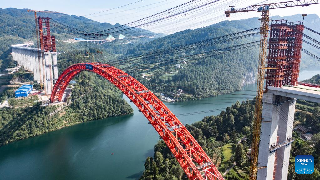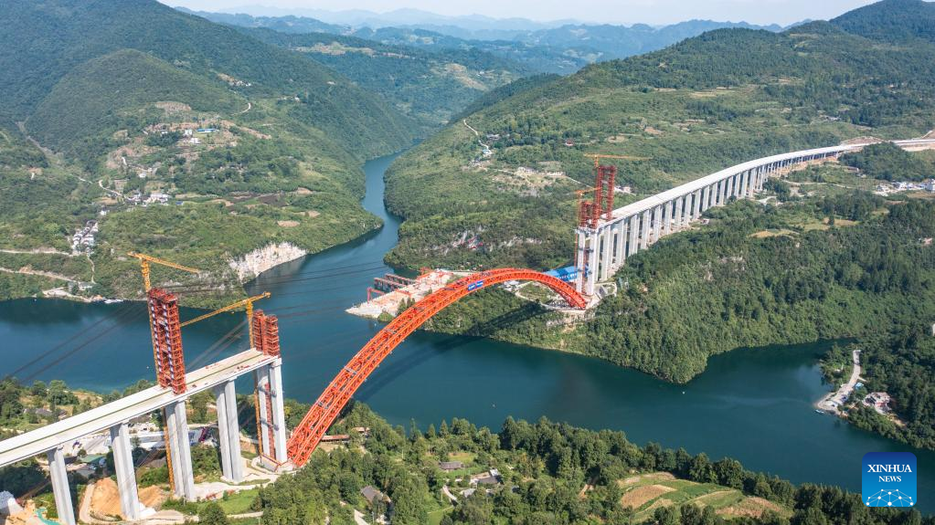 Aerial photo taken on Aug. 15, 2022 shows the construction site for the closure of Wujiang grand bridge, a main project of the expressway linking Dejiang and Yuqing, in southwest China's Guizhou Province. (Xinhua/Tao Liang)