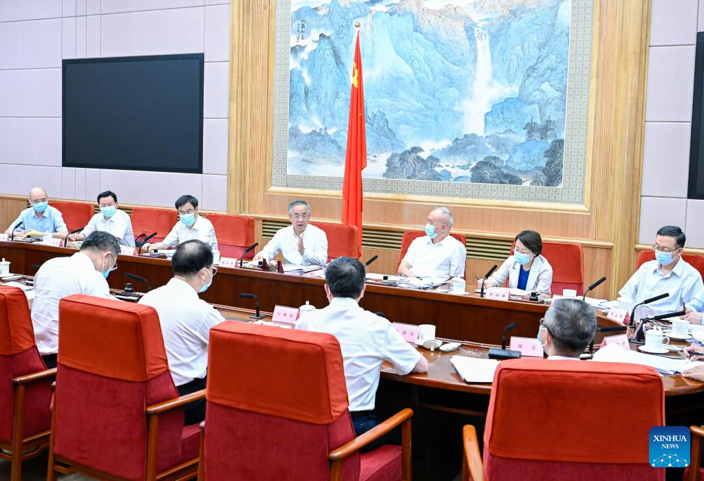 Chinese Vice Premier Hu Chunhua, also head of the organizing committee of the 2022 China International Fair for Trade in Services (CIFTIS), presides over a meeting of the committee in Beijing, capital of China, Aug. 16, 2022. (Xinhua/Zhai Jianlan)