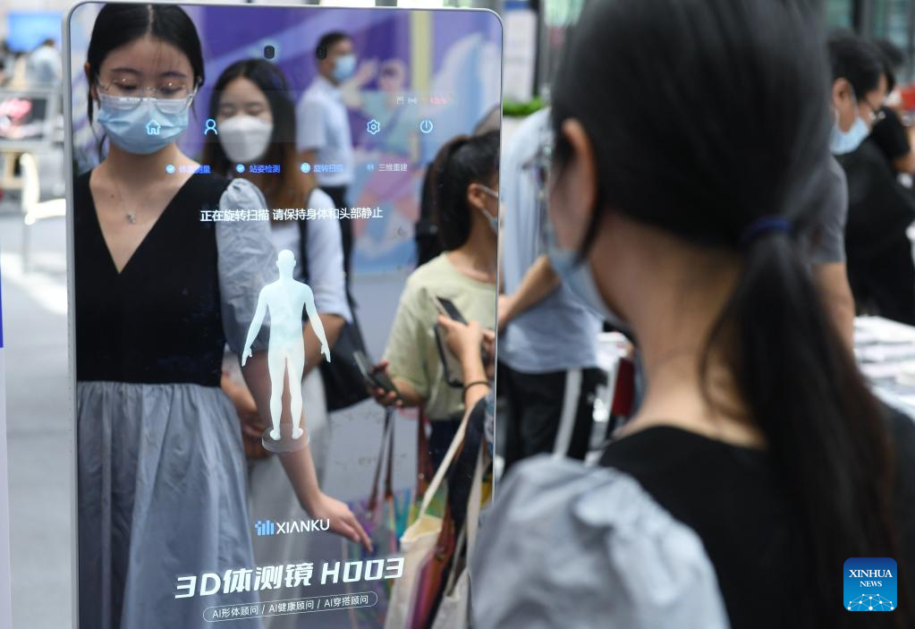 A visitor tries a 3D body measuring mirror at the 10th China Information Technology Expo in Shenzhen, south China's Guangdong Province, Aug. 17, 2022. (Xinhua/Mao Siqian)