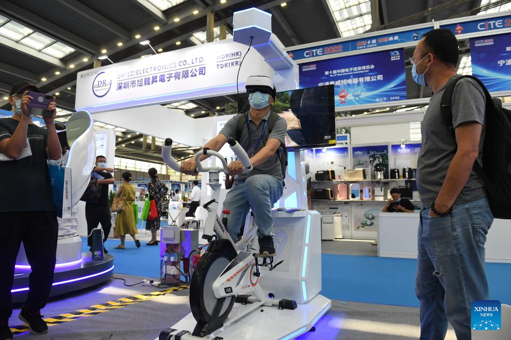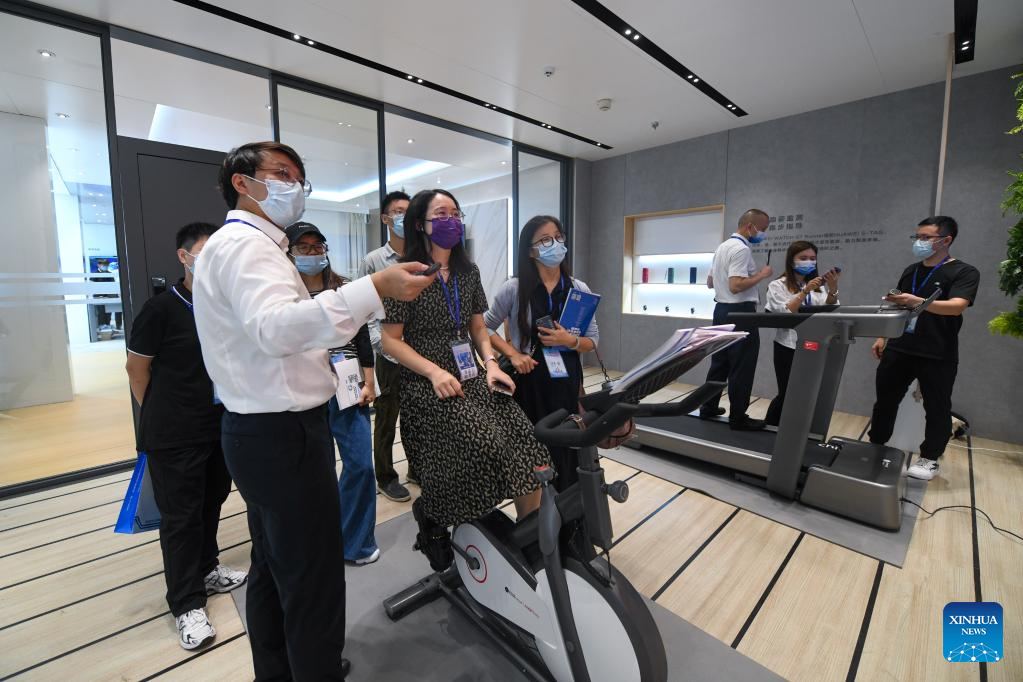 A visitor experiences intelligent fitness devices at the 10th China Information Technology Expo in Shenzhen, south China's Guangdong Province, Aug. 16, 2022. (Xinhua/Liang Xu)