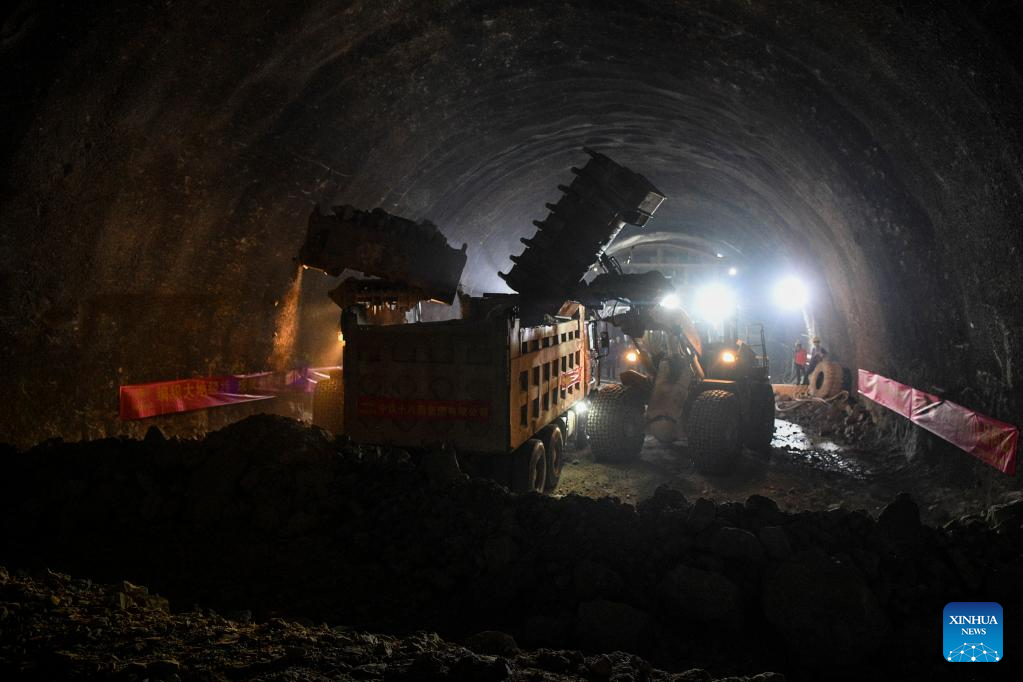 Workers operate at Jiuwandashan No.4 tunnel along the Guiyang-Nanning high-speed railway in Huanjiang Maonan Autonomous County, south China's Guangxi Zhuang Autonomous Region, Aug. 17, 2022.