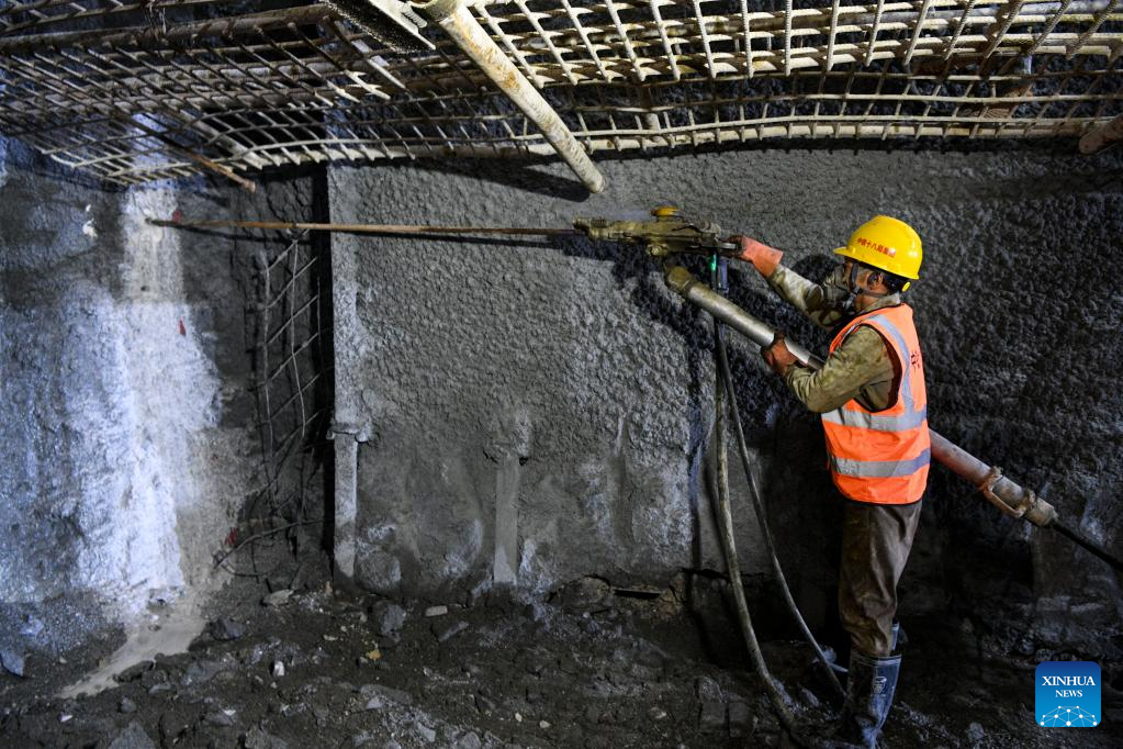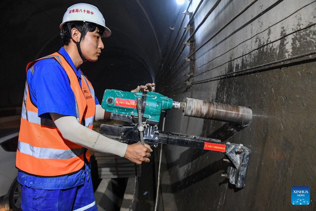 A worker operates at Jiuwandashan No.4 tunnel along the Guiyang-Nanning high-speed railway in Huanjiang Maonan Autonomous County, south China's Guangxi Zhuang Autonomous Region, Aug. 16, 2022.