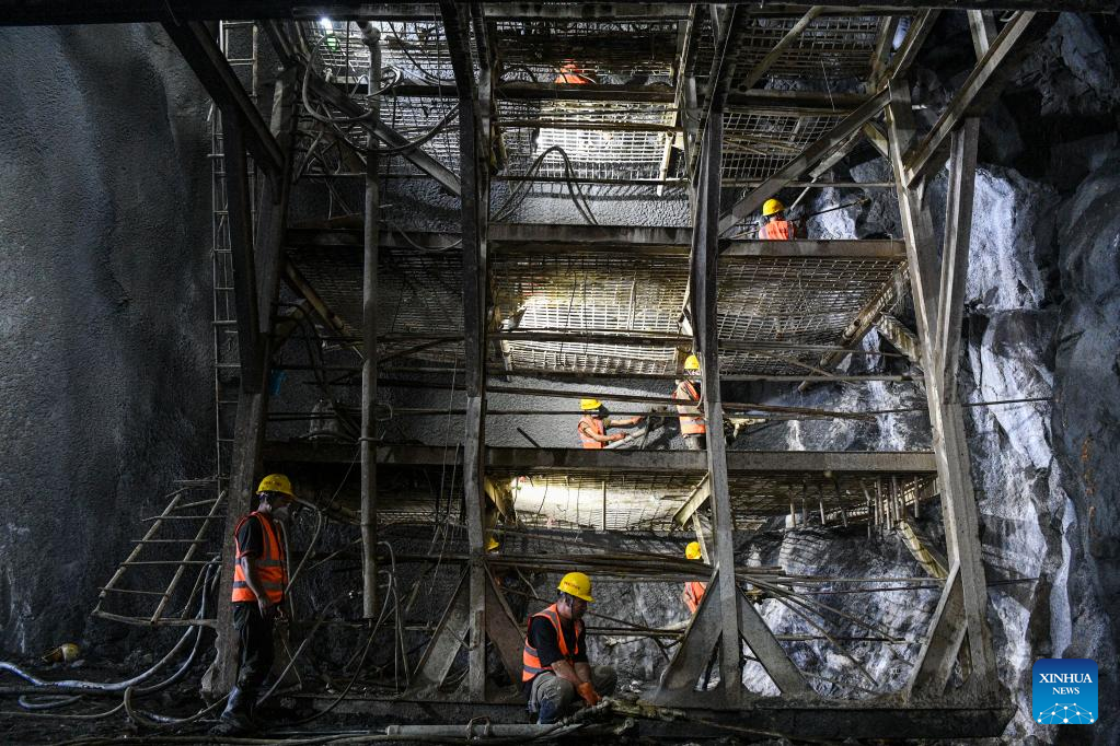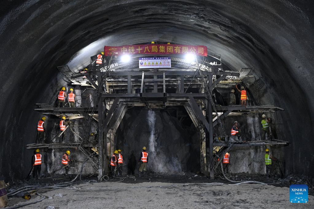 Workers operate at Jiuwandashan No.4 tunnel along the Guiyang-Nanning high-speed railway in Huanjiang Maonan Autonomous County, south China's Guangxi Zhuang Autonomous Region, Aug. 16, 2022.