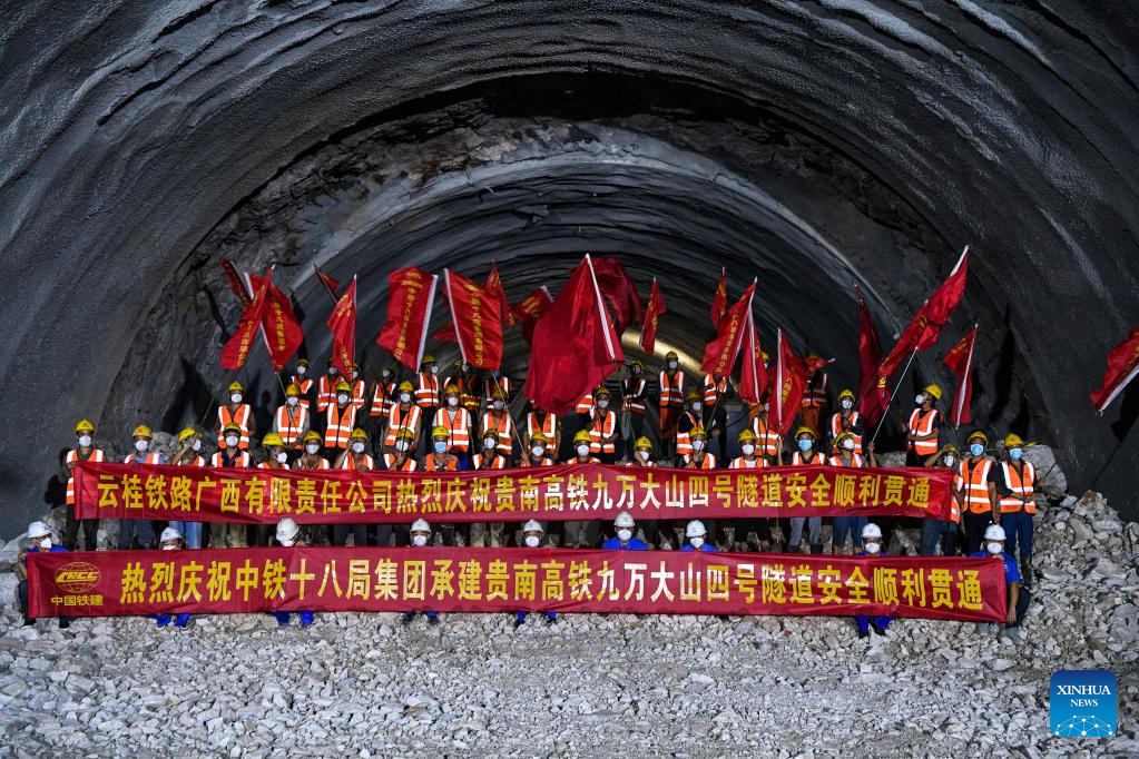 The 15,485-meter Jiuwandashan No.4 tunnel was drilled through on Wednesday, marking the completion of all 108 tunnels of Guiyang-Nanning high-speed railway line.
