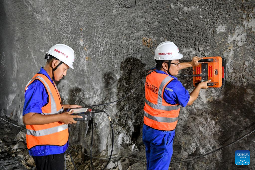 Technicians work at Jiuwandashan No.4 tunnel along the Guiyang-Nanning high-speed railway in Huanjiang Maonan Autonomous County, south China's Guangxi Zhuang Autonomous Region, Aug. 16, 2022.