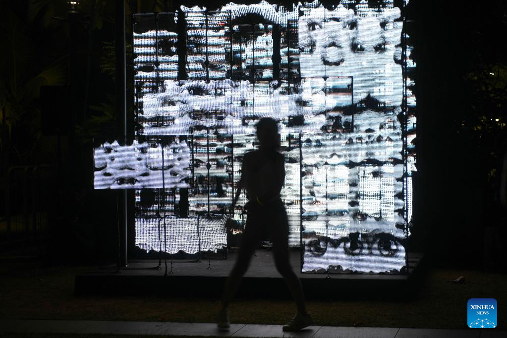 A visitor views light installations during the media preview of the Singapore Night Festival in Singapore on Aug. 17, 2022. (Photo by Then Chih Wey/Xinhua)