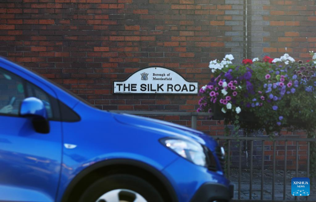 A car runs past "THE SILK ROAD" sign in Macclesfield, Britain, Aug. 11, 2022. The town of Macclesfield in northwest England was dubbed the "silk capital of England" in the 18th century, and now local entrepreneurs and artists are trying to keep this heritage alive. (Xinhua/Li Ying)