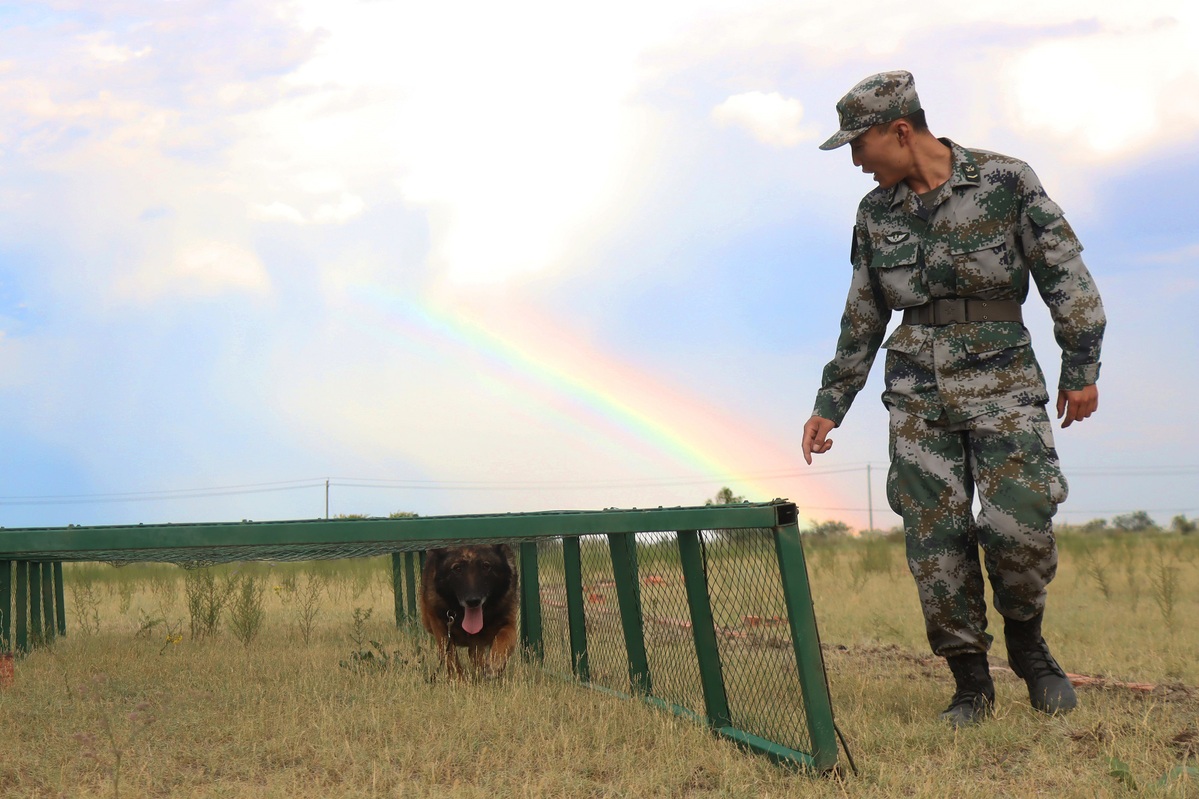 Yanlong, a military dog, practices at an obstacle course in a border detachment in Altay prefecture in the Xinjiang Uygur autonomous region. [Photo provided to chinadaily.com.cn]