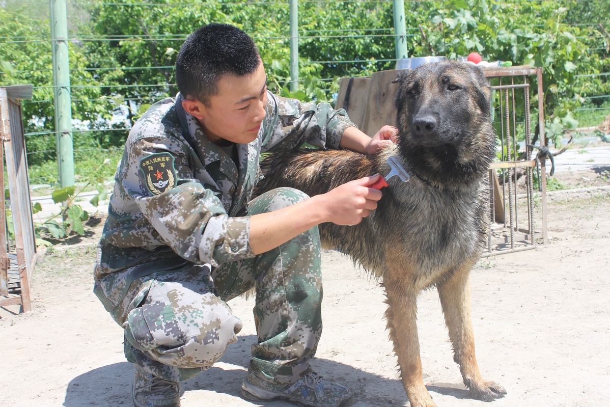 Yanlong, a military dog, enjoys a combing session in a border detachment in Altay prefecture in the Xinjiang Uygur autonomous region. [Photo provided to chinadaily.com.cn]