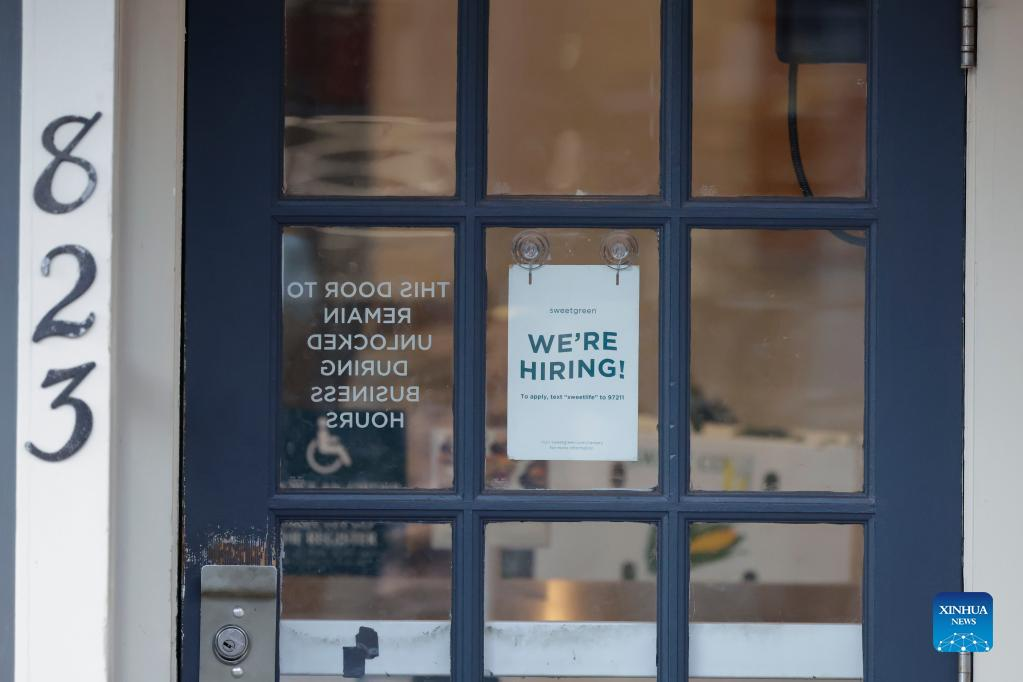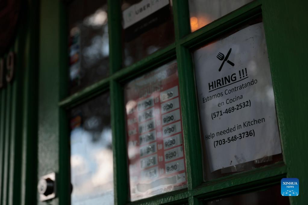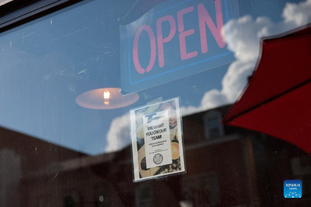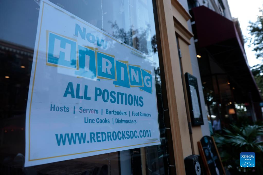 A hiring sign is posted on the window of a restaurant in the Old Town neighborhood of Alexandria, Virginia, the United States, on Aug. 18, 2022. Initial jobless claims in the United States last week dropped slightly to 250,000, hovering around nine-month high as the labor market shows signs of cooling, the U.S. Labor Department reported on Thursday. (Photo by Ting Shen/Xinhua)