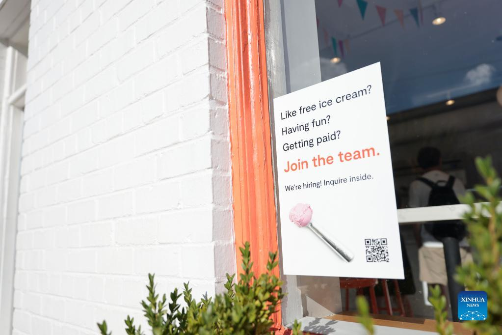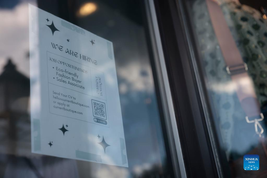 A hiring sign is posted on the window of a store in the Old Town neighborhood of Alexandria, Virginia, the United States, on Aug. 18, 2022. Initial jobless claims in the United States last week dropped slightly to 250,000, hovering around nine-month high as the labor market shows signs of cooling, the U.S. Labor Department reported on Thursday. (Photo by Ting Shen/Xinhua)