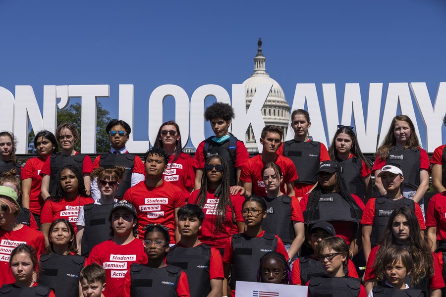 Students wearing bulletproof vests hold a rally near the Capitol Reflecting Pool in Washington, D.C., the United States, June 6, 2022. (Photo by Aaron Schwartz/Xinhua)