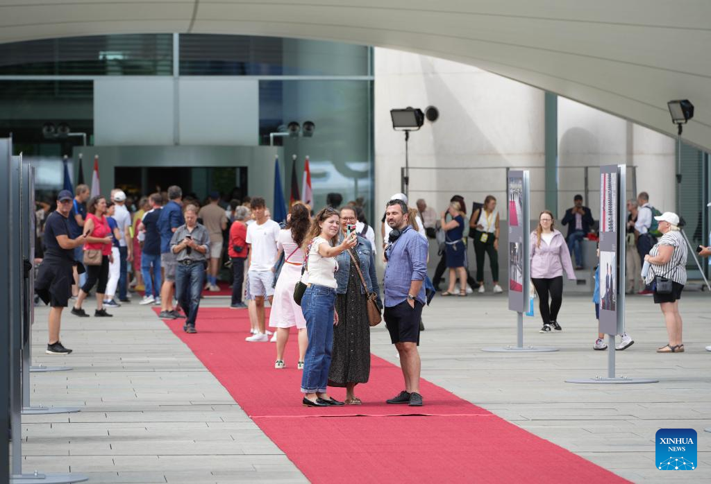 Visitors take a selfie at the German Chancellery during the German Federal Government open day in Berlin, Germany, on Aug. 21, 2022. Major political institutions of German federal government, including German Chancellery, opened to the public on Saturday and Sunday. (Photo by Stefan Zeitz/Xinhua)