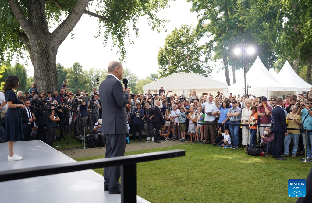 German Chancellor Olaf Scholz (Front) speaks in front of visitors at the German Chancellery during the German Federal Government open day in Berlin, Germany, on Aug. 21, 2022. Major political institutions of German federal government, including German Chancellery, opened to the public on Saturday and Sunday. (Photo by Stefan Zeitz/Xinhua)