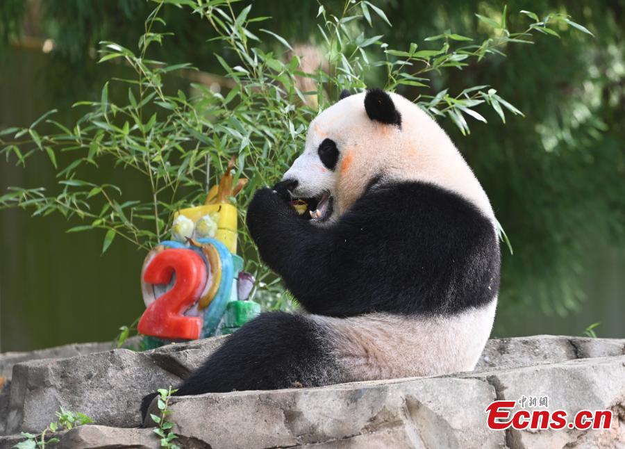 Giant panda "Xiao Qi Ji" enjoys its birthday cake at Smithsonian's National Zoo in Washington, D.C., U.S., Aug. 21, 2022. (Photo: China News Service/Chen Mengtong)