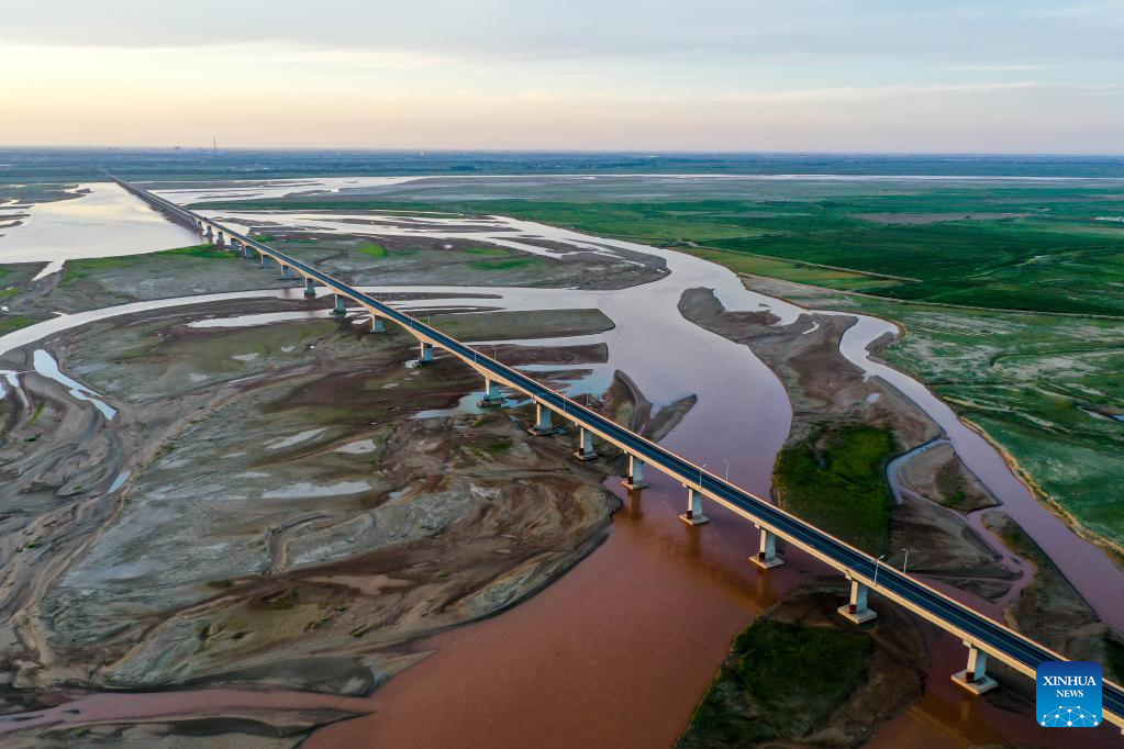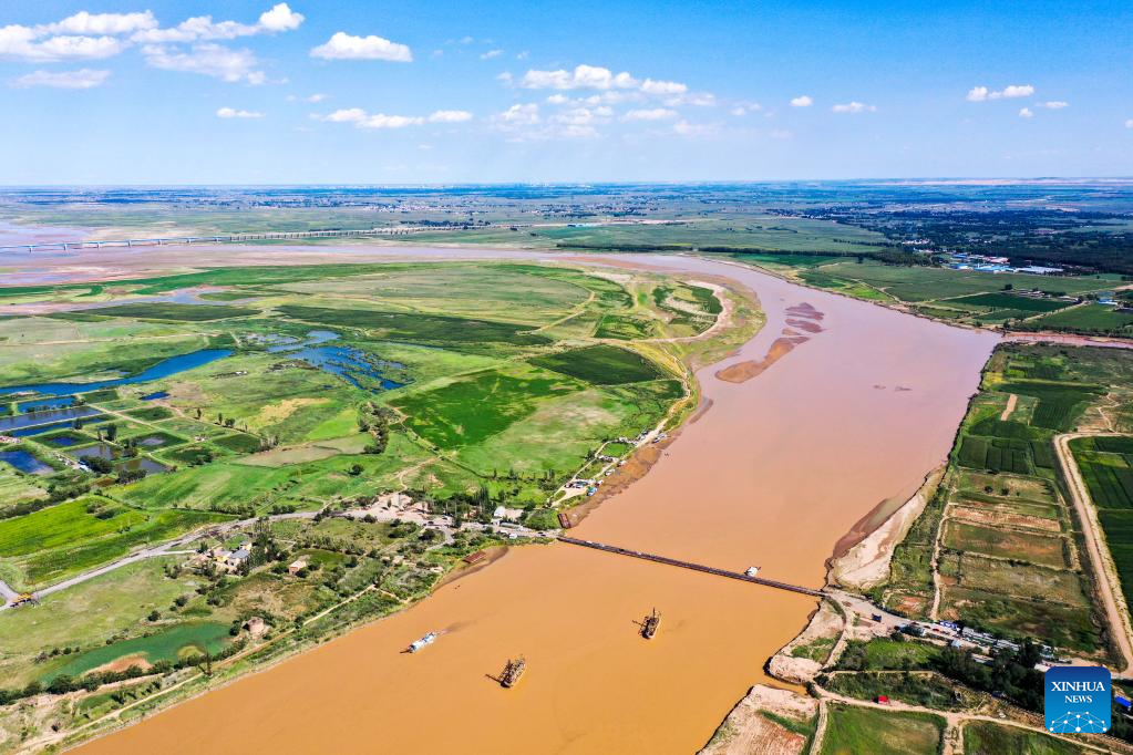 Aerial photo taken on Aug. 16, 2022 shows the Yellow River in Hanggin Banner in Erdos, north China's Inner Mongolia Autonomous Region. (Xinhua/Lian Zhen)