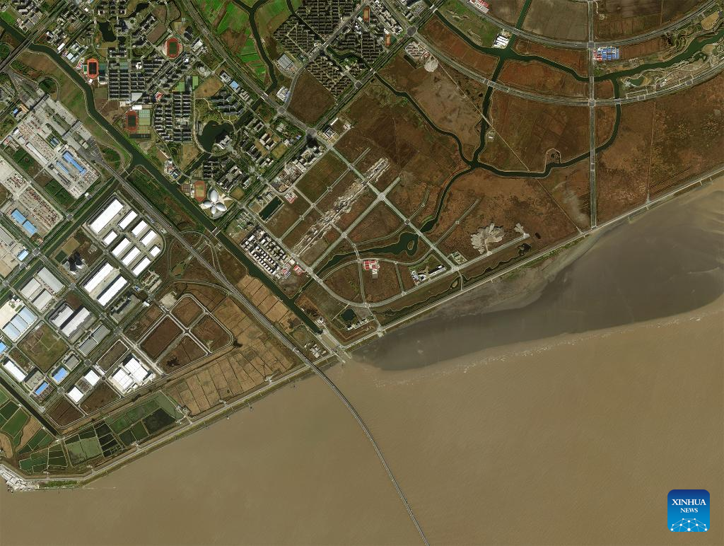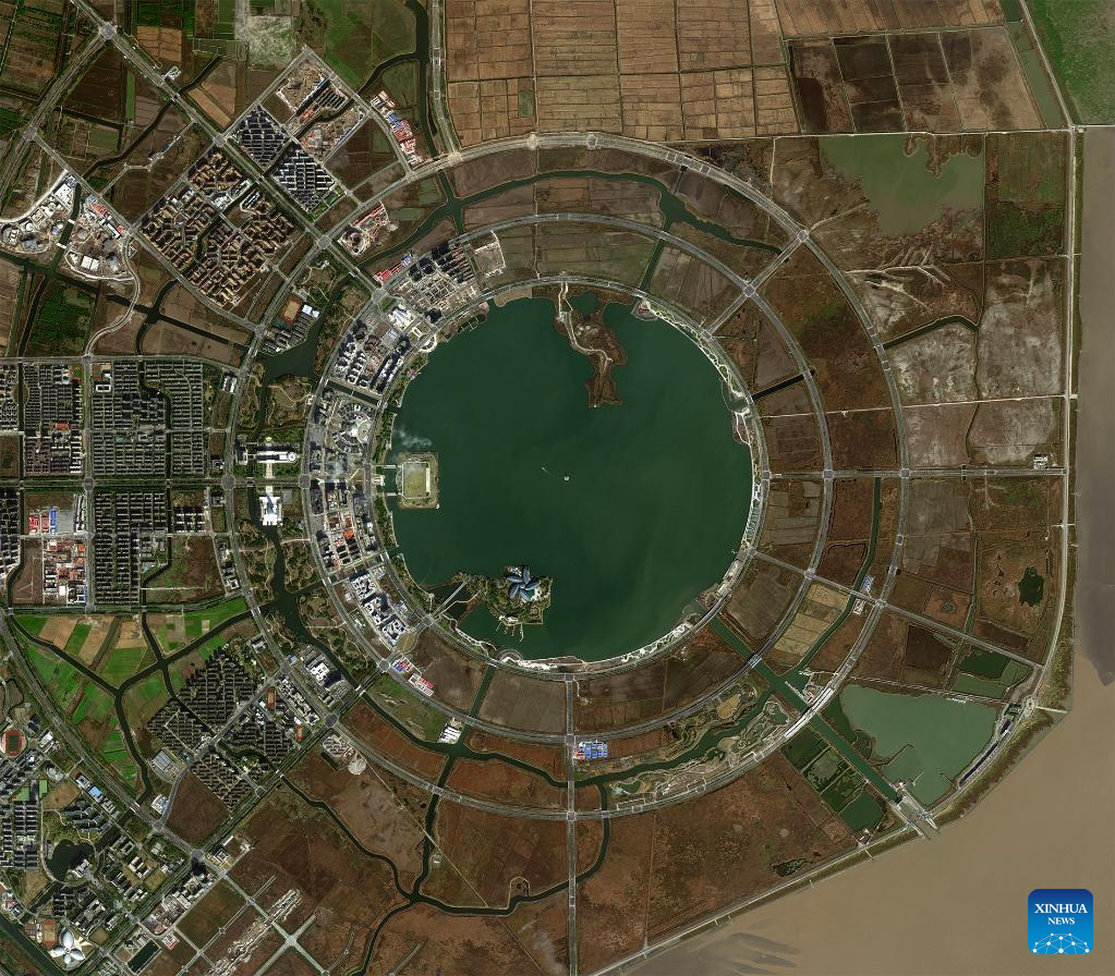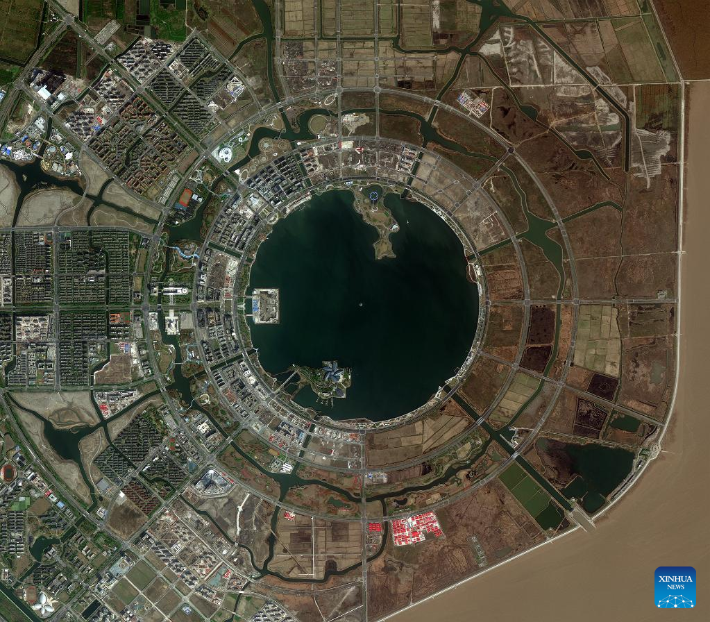 Image captured by a Gaofen series satellite on March 3, 2022 shows the Dishui Lake in Lingang new area of the China (Shanghai) Pilot Free Trade Zone in east China's Shanghai. Saturday marked the 3rd anniversary of the launching of Lingang new area. A series of remote sensing images captured by China's Gaofen series satellites record the changes of Lingang new area from 2017 to 2022. (Xinhua)