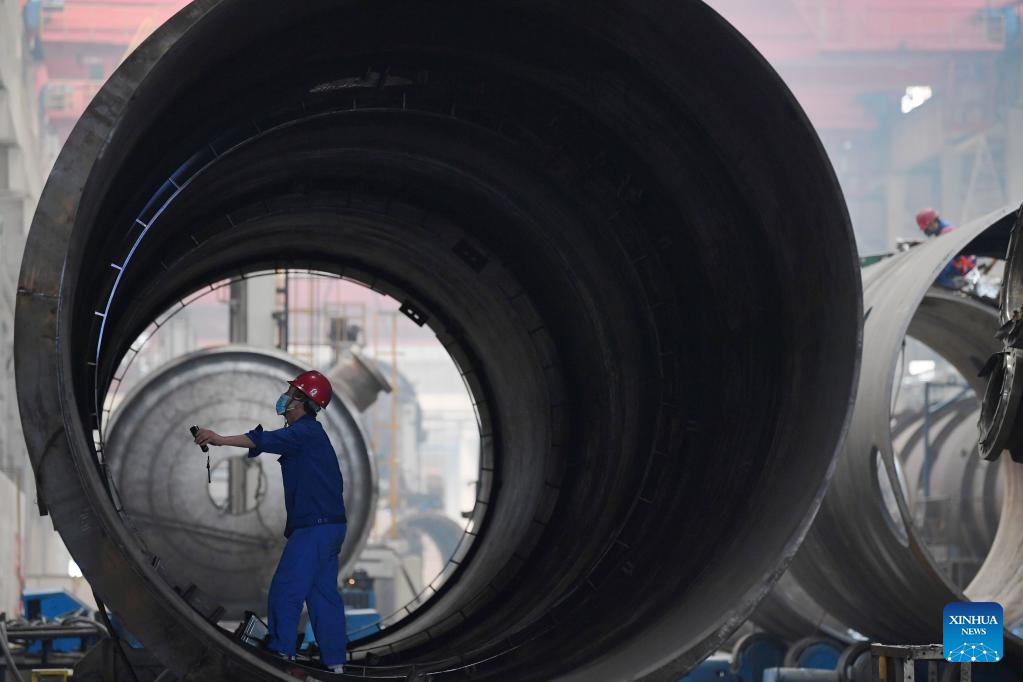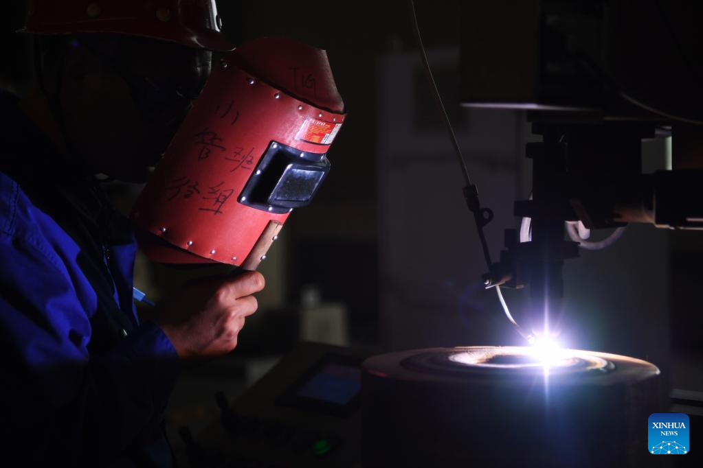 An employee works in a workshop of LS Group High Tech Equipment Industrial Park in Lanzhou New Area in Lanzhou, northwest China's Gansu Province, Aug. 11, 2022.